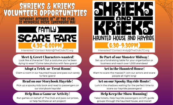The Club Lunenburg Teen Center is looking for help for our 9th annual Shrieks and Krieks Festival on Saturday, October 18th! Seeking businesses to adopt a room (no cost - just bring candy and any swag to promote your business) in the Haunted House for Trick or Treat during the Family Scare Fare (4:30-6pm, seeking volunteers to "act" in our Haunted House and along our Hayride route (6:30-9:30pm), and seeking "tour guides" to escort groups of young people through the Haunted House (6:30-9:30pm) to protect our actors and props! For more info, contact Michelle - 978-582-6407x2, or email Michelle@TheClubLTC.org